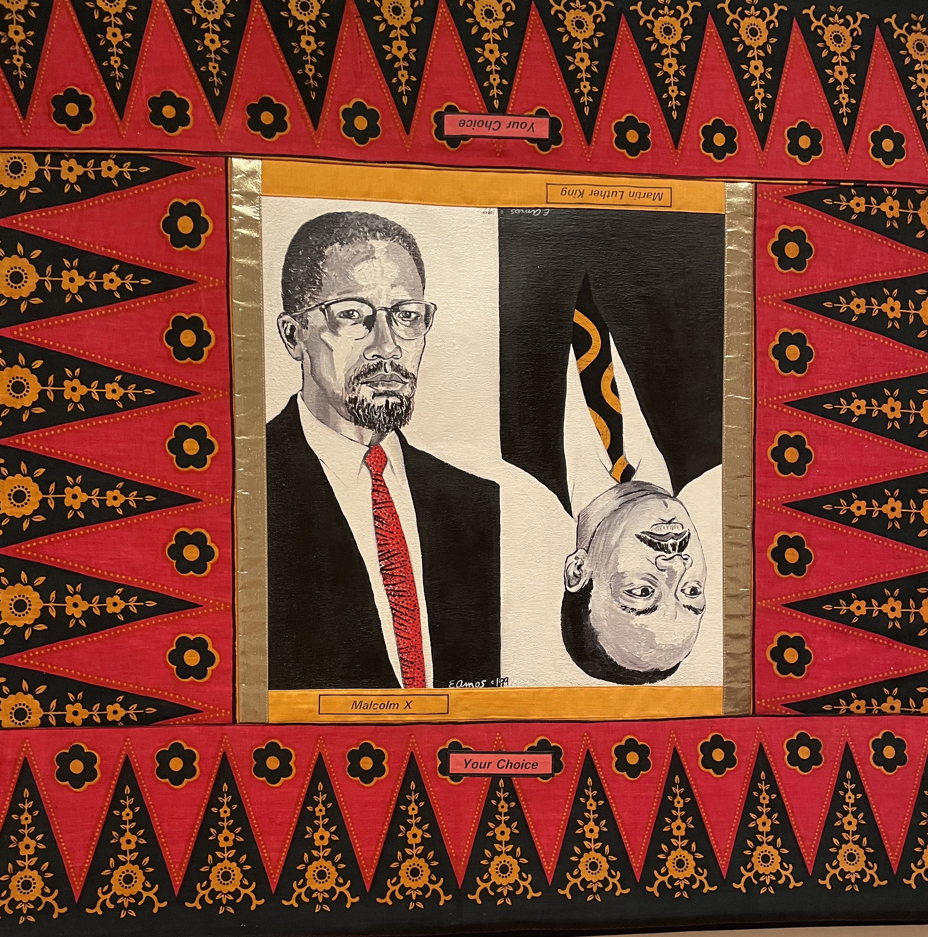 This painting by Emma Amos called "Your Choice" is showing M.L.K. Jr. and Malcolm X side by side, one's upside down and one is right side up. It says: "Your Choice." Amos is asking what kind of anti-racism you want to do: Black Power or non-violence. How about you? What do you want to do?